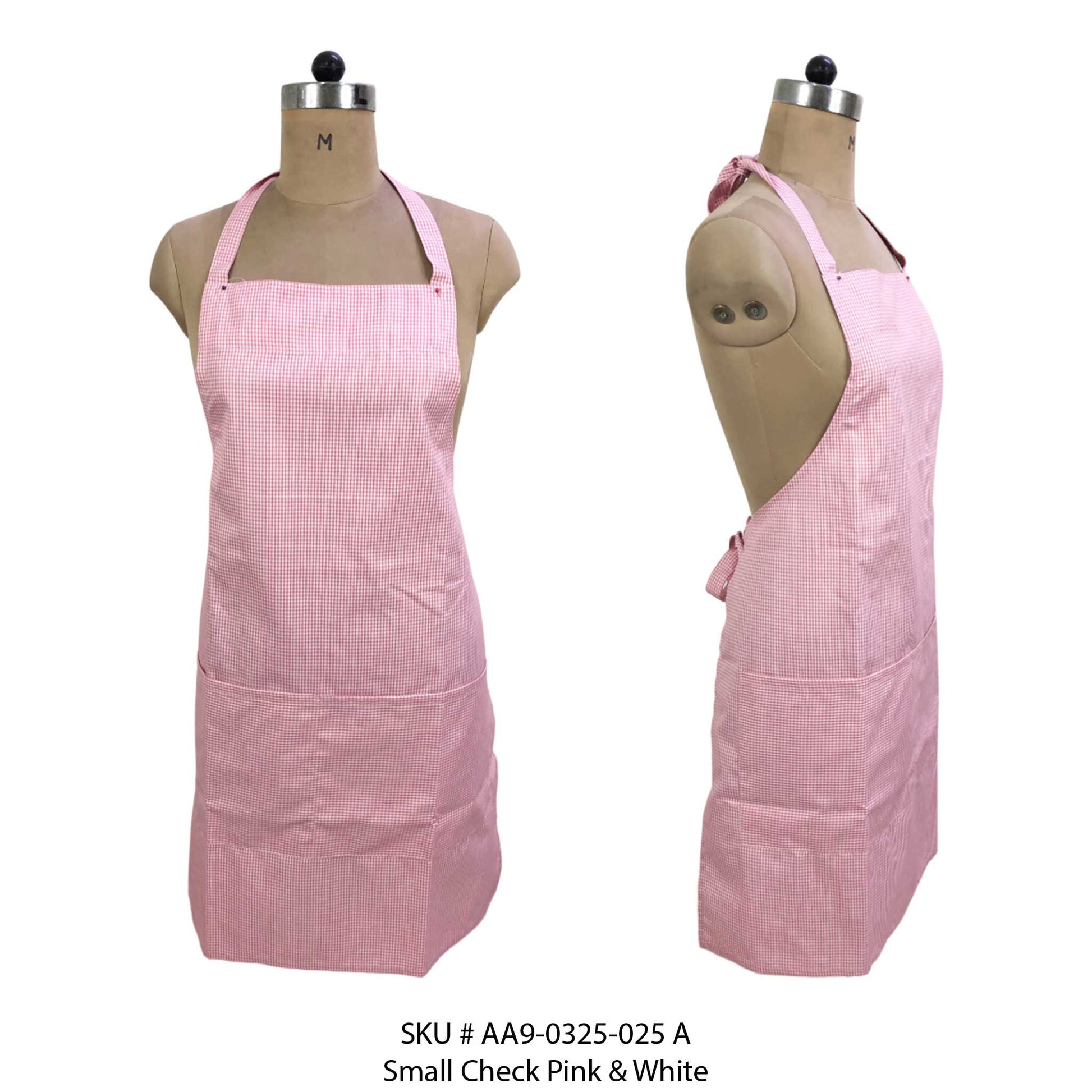 Small-check apron with adjustable neck, long ties, and convenient front pocket.