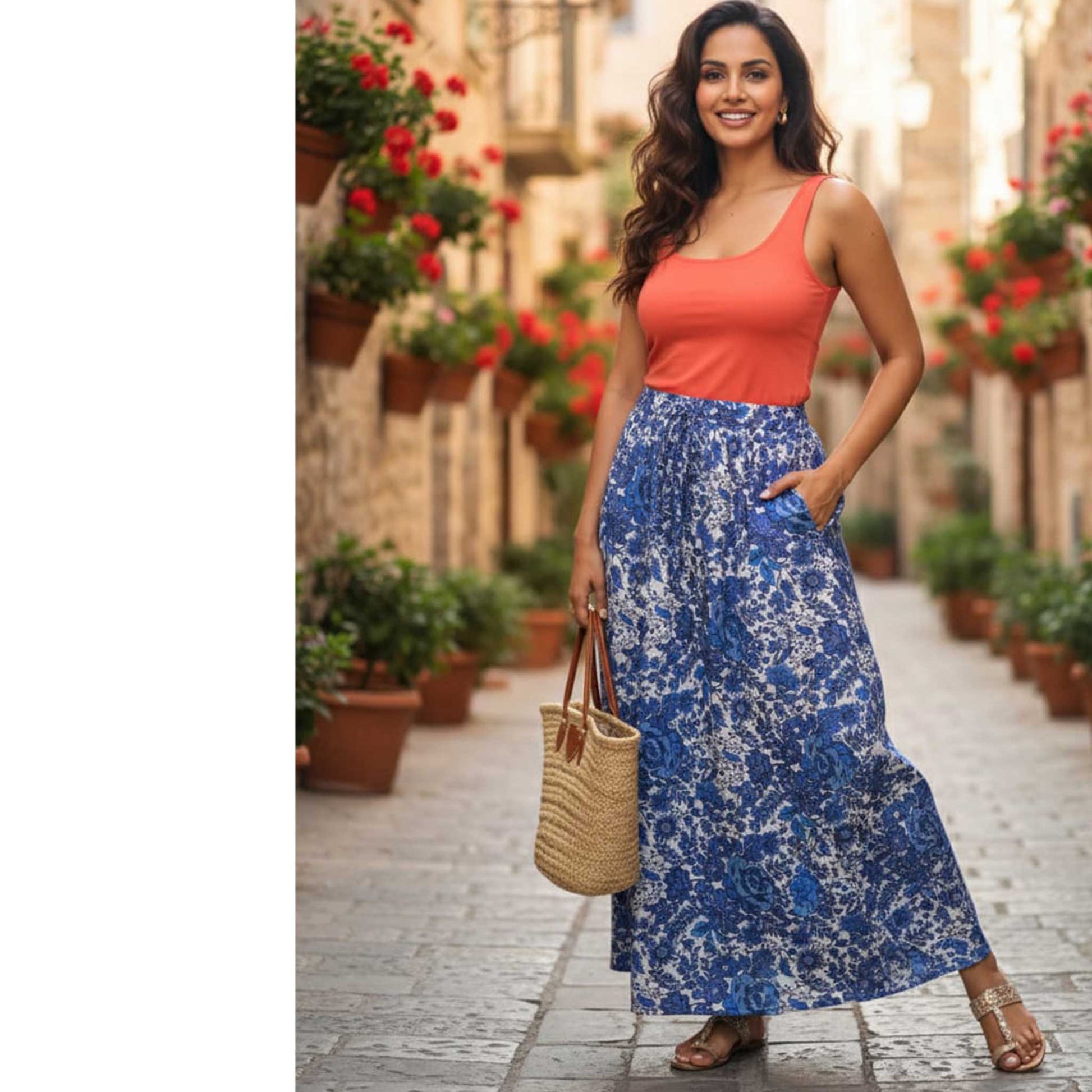Floral Blue Satin Skirt , 41” Flowing Printed Skirt