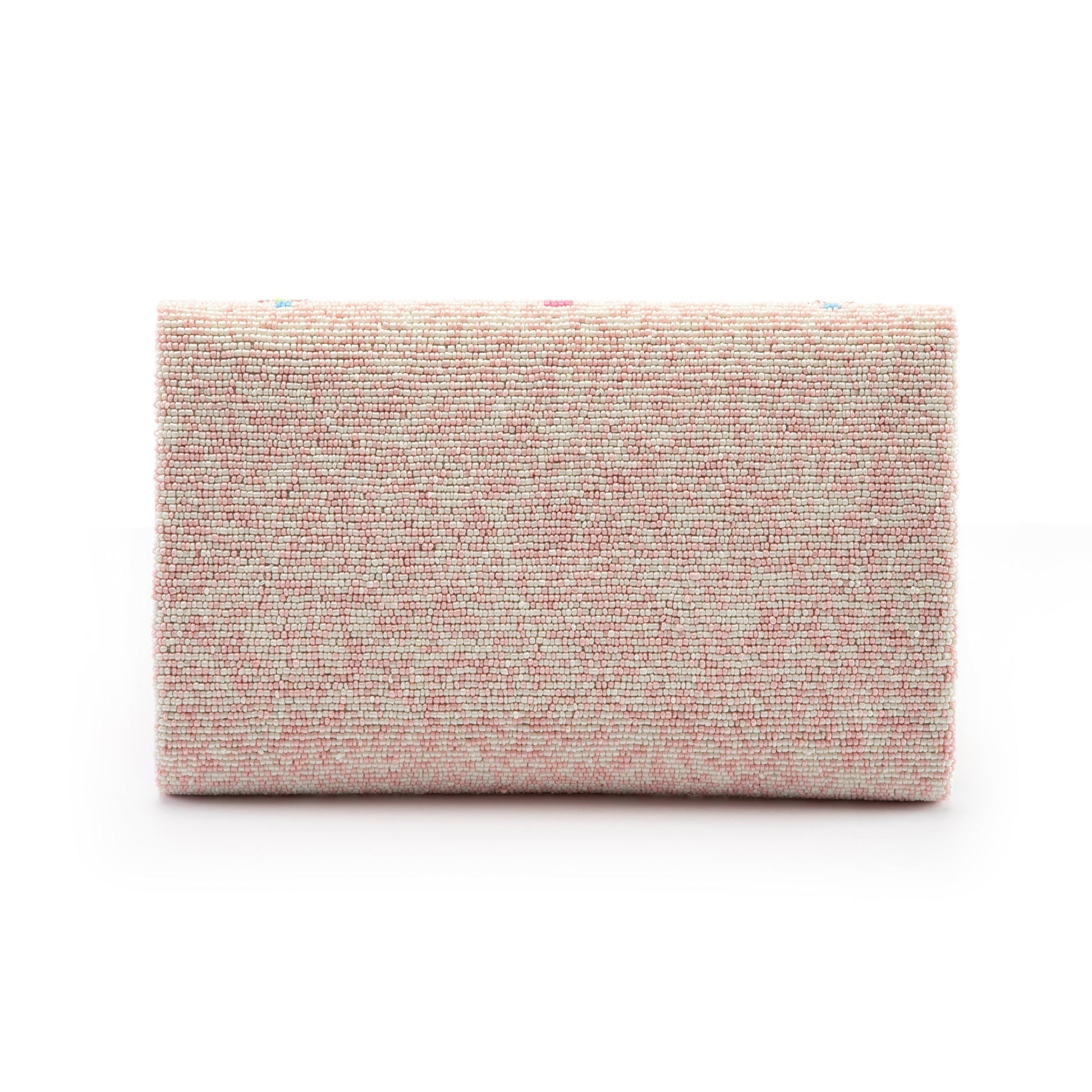 The Guptra Clutch showcases tribal designs brought to life with a vibrant array of joyful hues. This envelope-style clutch features a base of pink-and-white beads, creating a lively canvas for geometric motifs. Each clutch is meticulously handmade by skilled Indian craftswomen, reflecting traditional artistry and contemporary flair. Finished with a chic gold chain, the Guptra Clutch combines vibrant colors with elegant detailing, making it a perfect accessory for adding a touch of happiness and style to any outfit.
