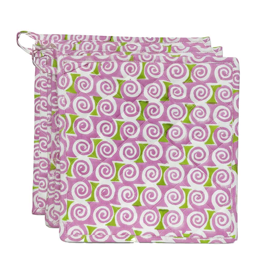 This heavy quilted pot holder set features a spiral printed design on a pink base. Made with thick, durable padding, it provides excellent heat protection while handling hot pots and pans. Long-lasting, practical, and perfect for everyday kitchen use.