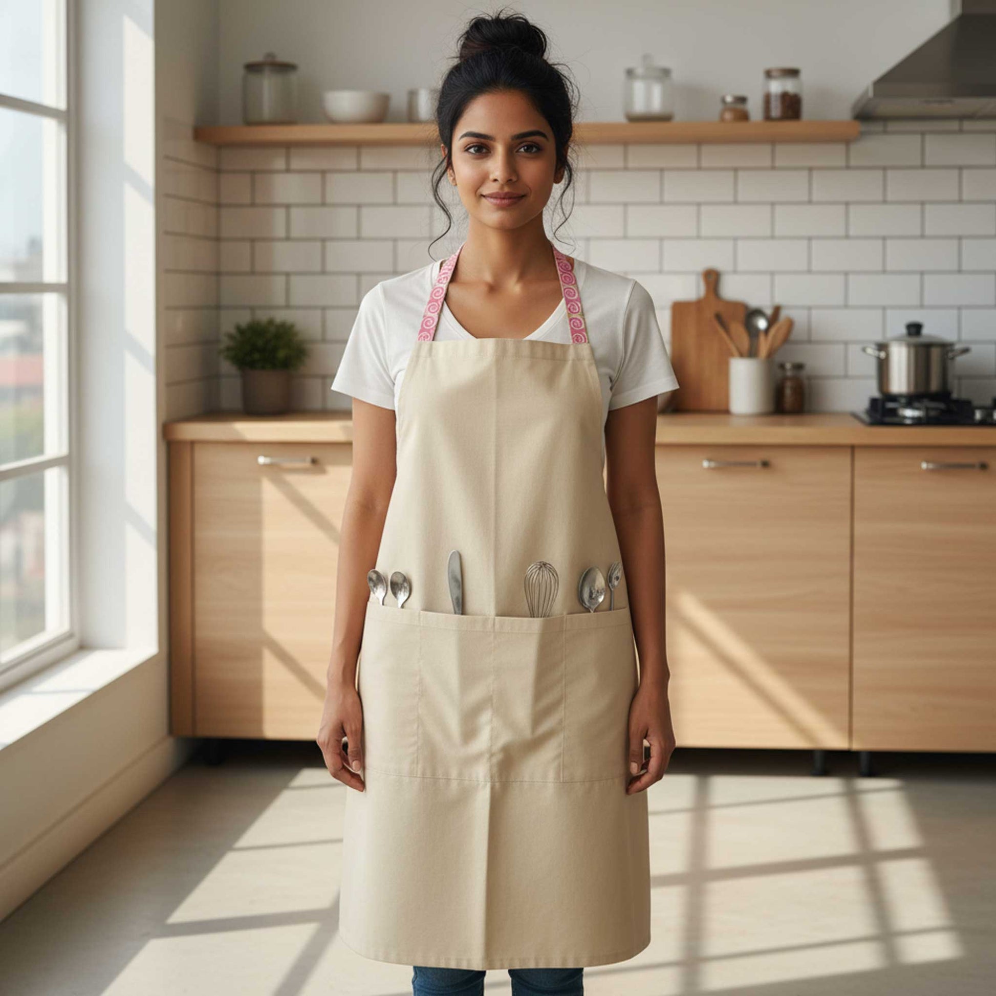 Stylish reversible apron with 4-section inside pocket for convenient daily use. Can be worn on both sides. Made from premium hand block print cotton and flex cotton. Comfortable, durable, and ideal for kitchen, cooking, or home use.