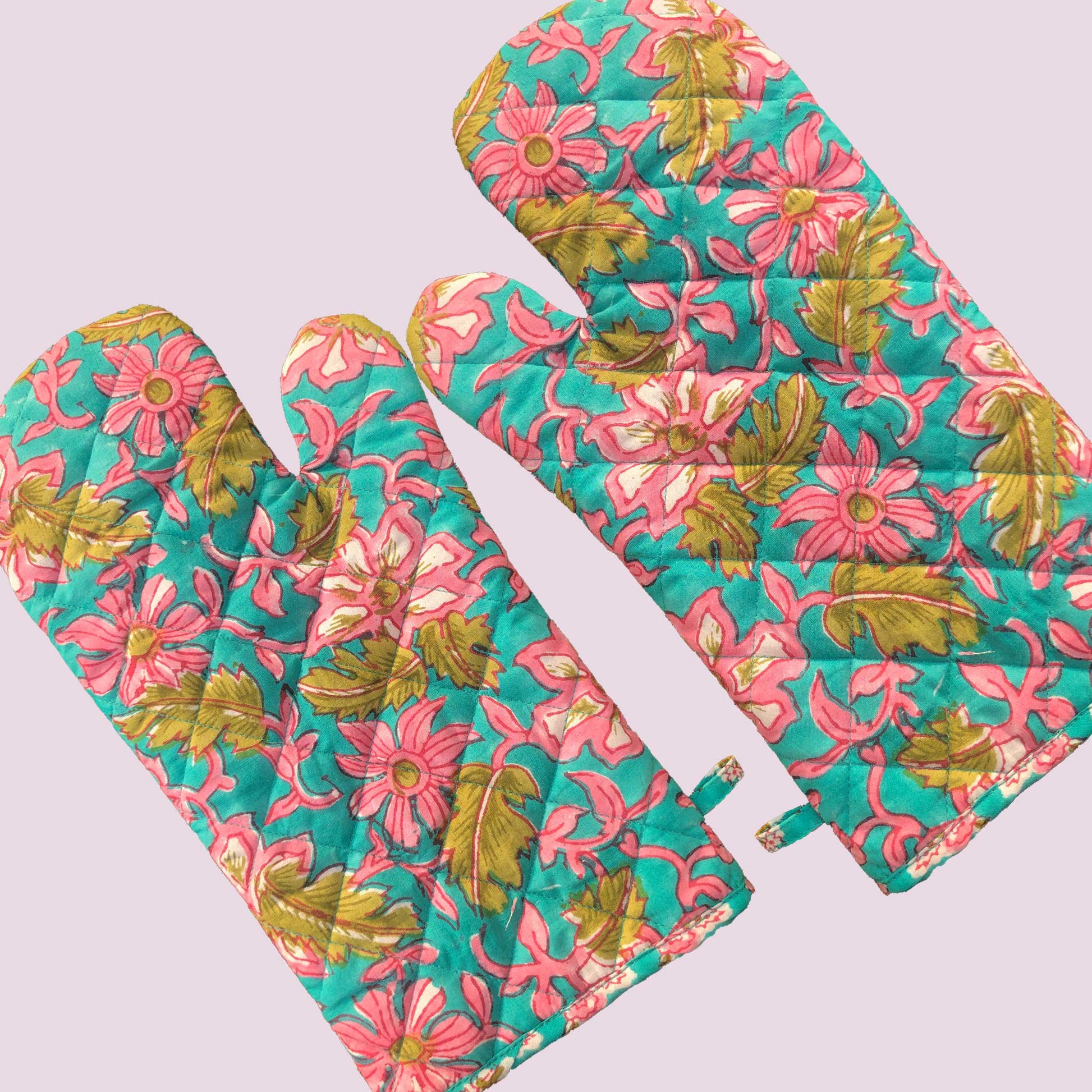 This oven mitt features a vibrant turquoise base with pink floral and olive leaf prints. Softly quilted for comfort and heat protection, it offers a secure grip while handling hot pots and trays, adding a fresh and colorful look to your kitchen.