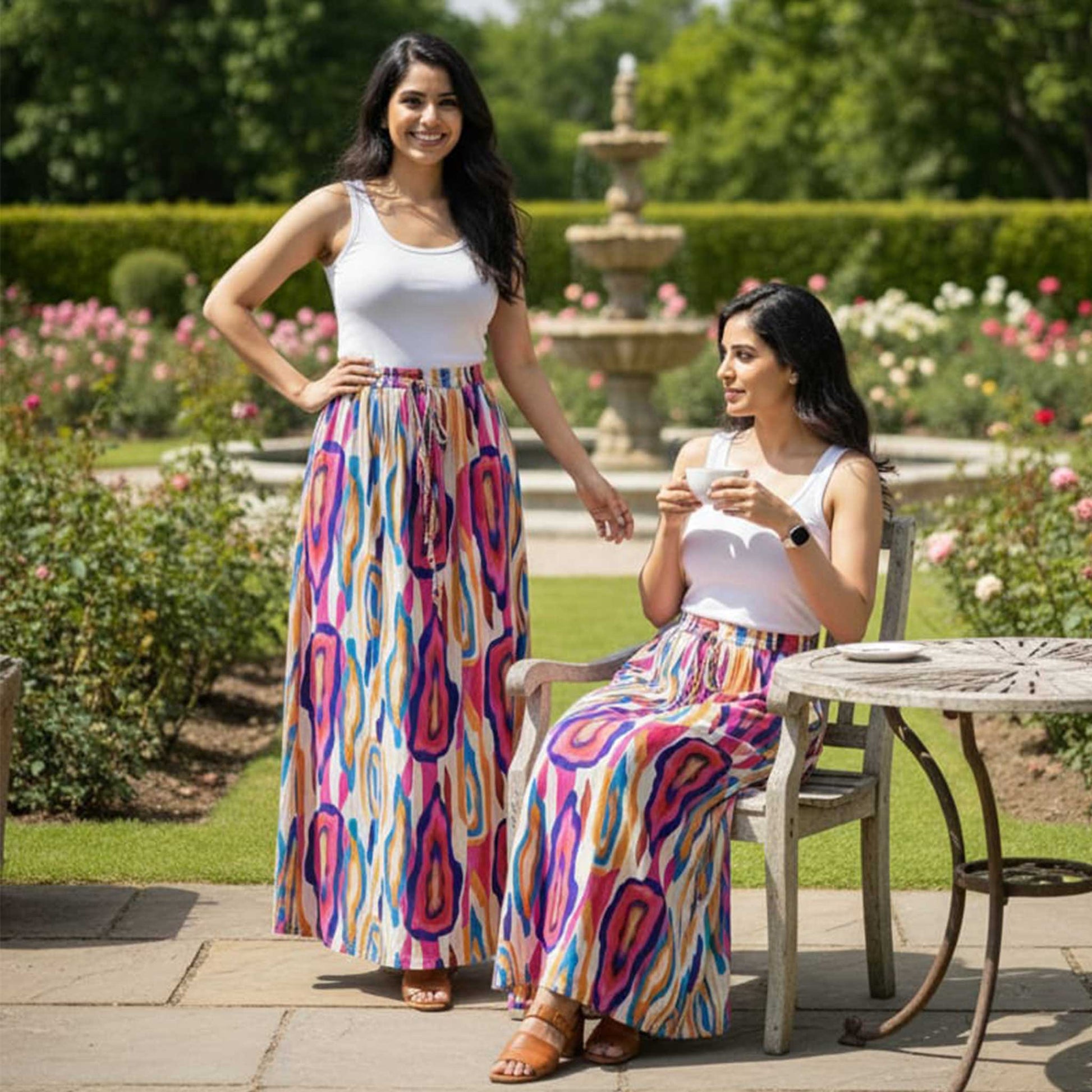 Vibrant 41" skirt in colorful ikat print, made from soft satin polyester. Features an elastic waistband with drawstring for comfort and style. Perfect for casual or summer outings.